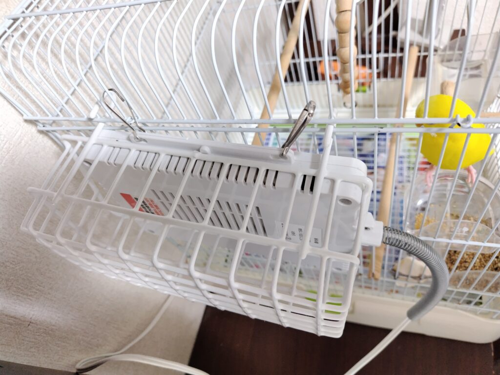 この方法で、中国地方のわが家では2~3月頃の室温が10℃を下回った朝方でも、鳥かごのヒーター付近は18℃前後を保てていました。