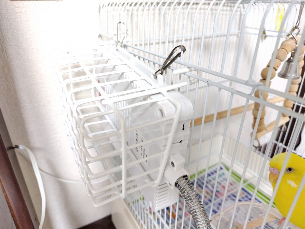 ワイヤーカゴにひっかけ部分があり、鳥カゴに引っ掛けるとヒーターのまわりに7cmほど空間が作れます。