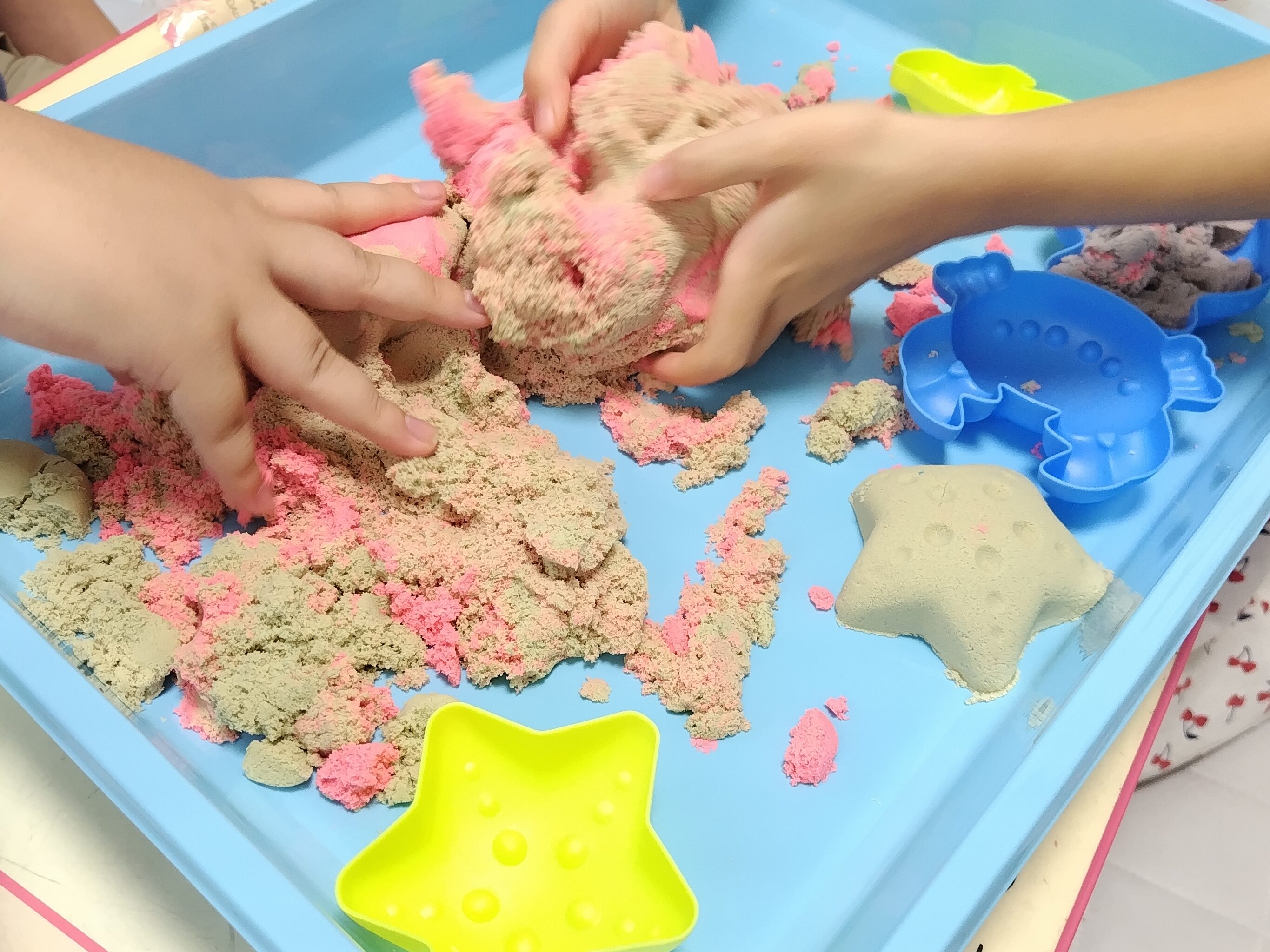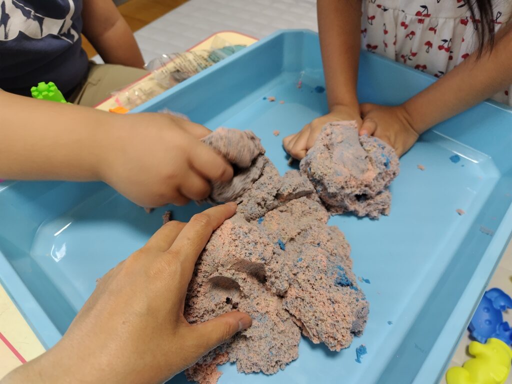 砂は見た目は普通の砂ですが、触ってみると手にくっつかず、しっとりまとまりがよくて不思議な感触。