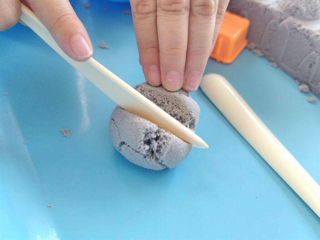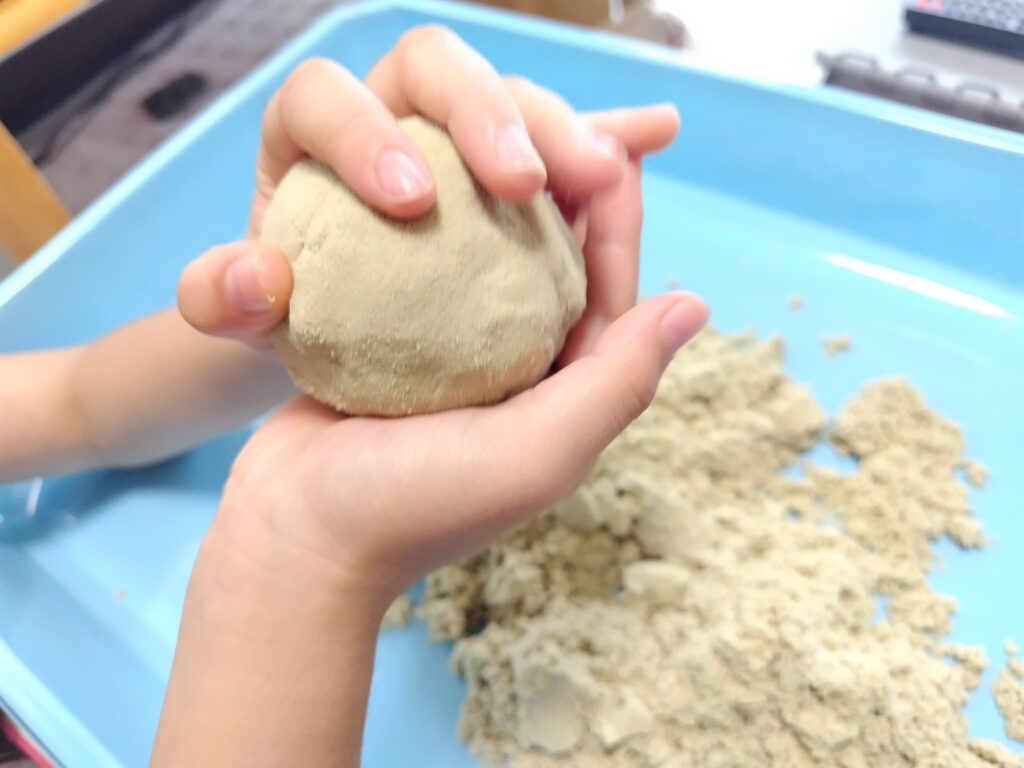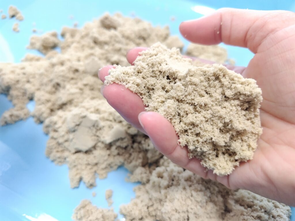 砂は見た目は普通の砂ですが、触ってみると手にくっつかず、しっとりまとまりがよくて不思議な感触。