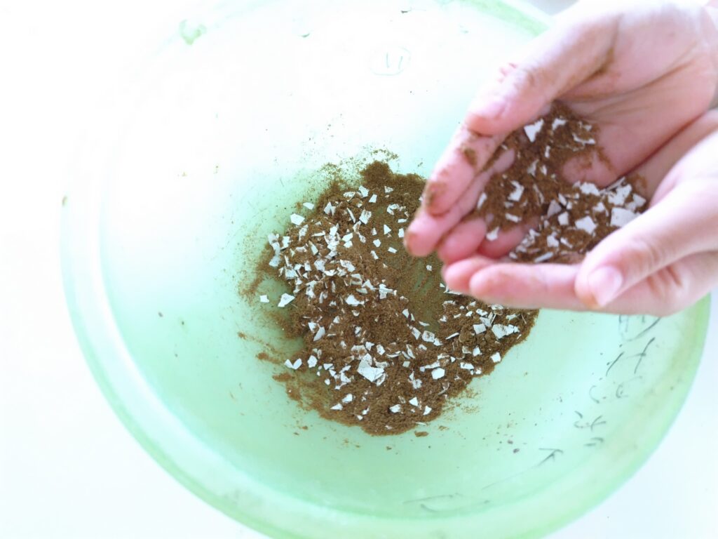 卵の殻も混ぜています。